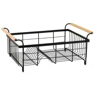 Black Dish Drainer With Wooden Handles.
